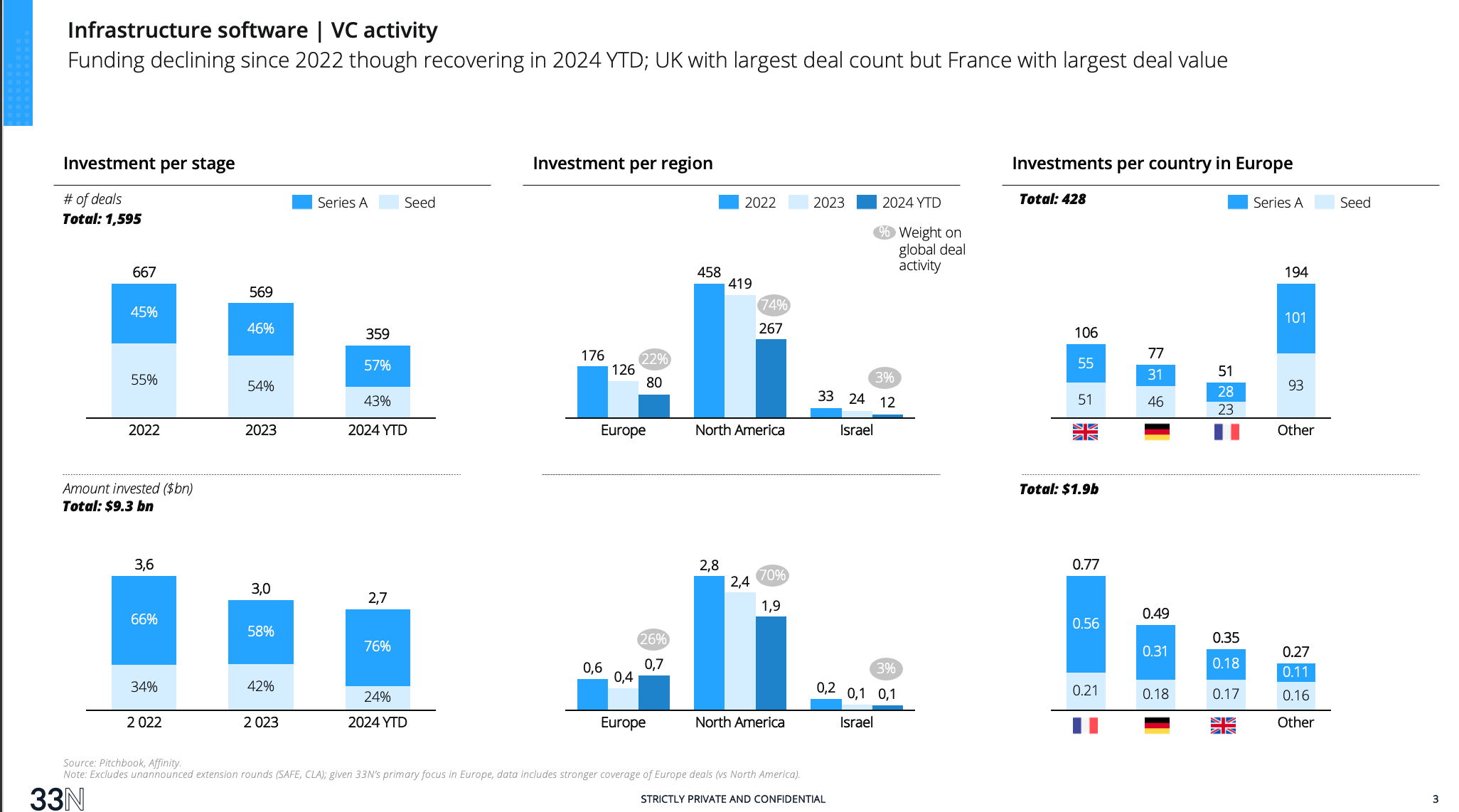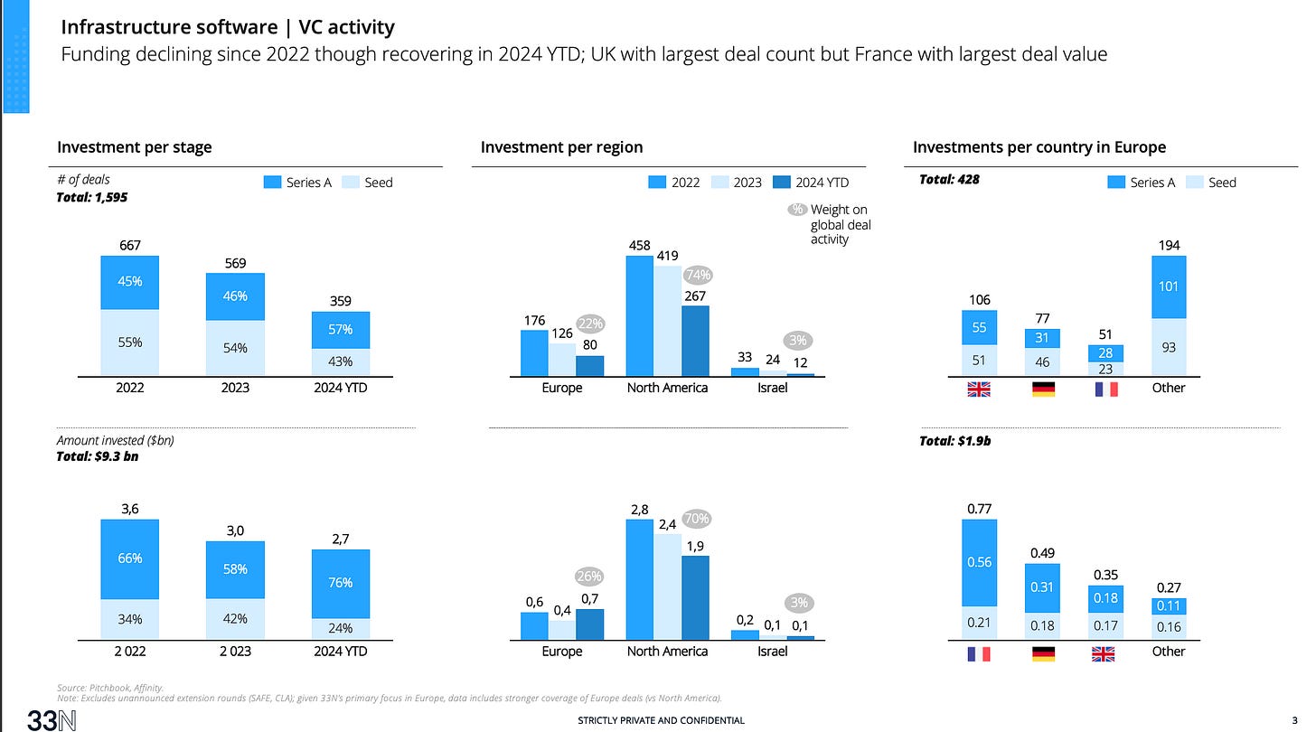 Overall, just like cyber, infrastructure software hasn’t been totally immune to the global decrease in VC funding, with a decrease in both deal volume and value in 2023. For 2024 however, investment in year to date (until August) already showed promising signs of an upward trend. Geographically, North America takes the lion share with 70-80% of deal count and value, Europe 20-25% and Israel the remaining. This data doesn’t consider unannounced extension rounds (often in the form of convertible note or SAFE) which volume is unknown and could easily correct the downward trend (our perception is that 2023 saw a lot of extensions).
