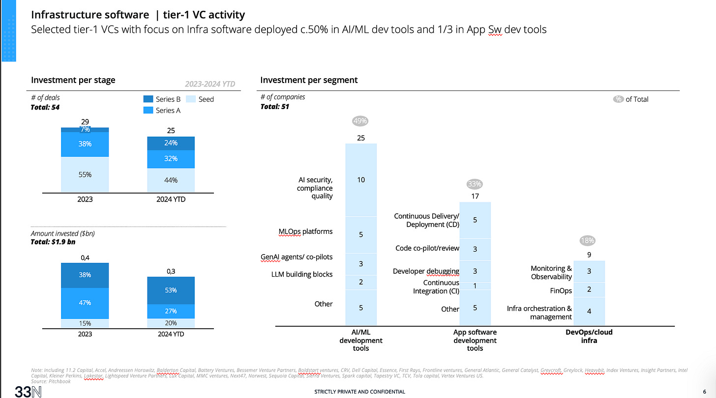 From a market segment perspective, c. 50% of investment volume went to AI/ML development tools, followed by App software (33%) and DevOps/Cloud infra (18%). In a sub-segment perspective: